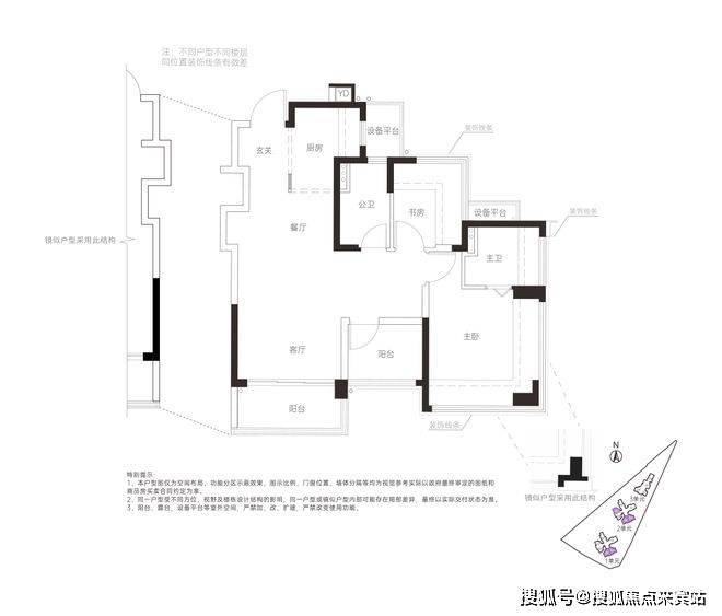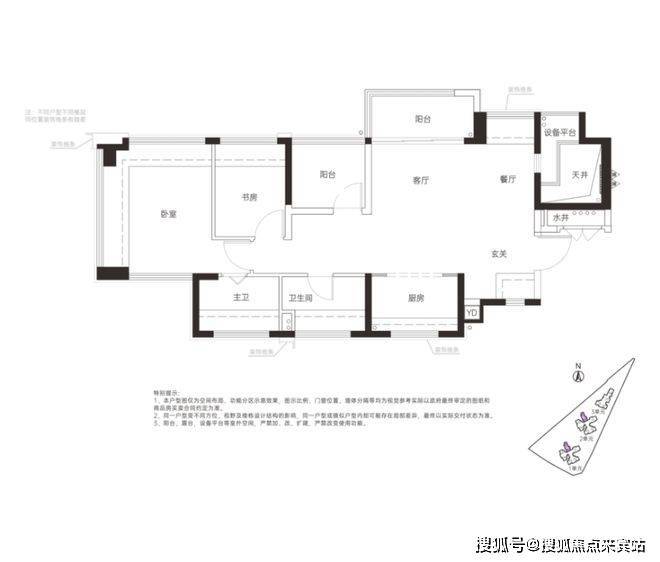 竖厅动静分区,S型墙内嵌冰箱位,“阳台”和“书房”处实际可以做房间。