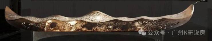 由广东非遗剪纸大师饶宝莲亲手打造的“勇立潮头舟”跃然眼前。整个作品采用铜凿剪纸和金漆木雕结合的工艺,镂空雕刻了羊城八景的纹样。在庭院水景的映衬下,犹如龙舟竞渡,生生不息,寄寓着天曜业主抢占先机,敢为人先的进取精神。