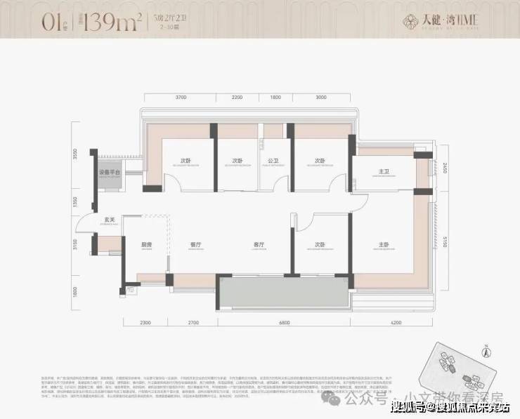 住宅楼的结构分布是一层5户,每层配有两个电梯。南侧品字形为两户113㎡竖厅,中间双翼为两户115-139㎡横厅,背侧为单户114㎡竖厅。