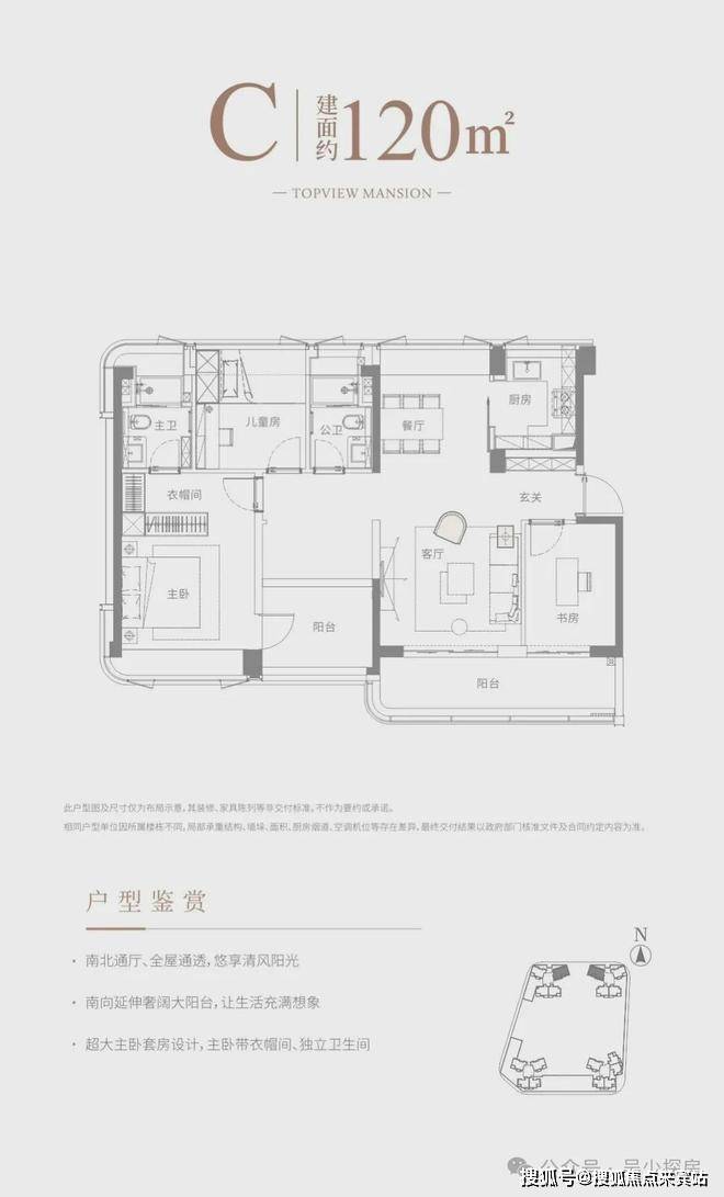 120㎡的4房2厅2卫,设计的横厅南北通透格局,进门入户玄关,四开间朝南,3个卧室分别是3.6米/3米/2.9米的宽度,另一个卧室不知道尺寸,客厅连接卧室出6.2米大阳台,U型厨房,得房率:75.91%(不含赠送),阳台主朝西南或东南向。