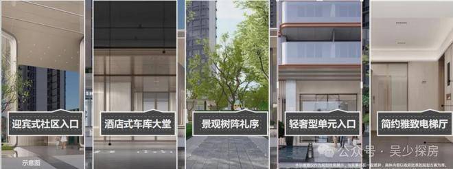 峰境五重归家礼序:巡宾式社区入口+酒店式车库大堂+景观树阵礼序+轻奢型单元入口+简约雅致电梯厅。