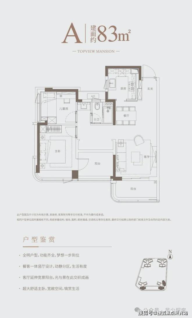 83㎡的3房2厅1卫,设计的是竖厅格局,客厅3.4米开间,客餐厅一体化,三开间朝阳,3个卧室分别是3米/2.9米/2.6米的宽度,U型厨房,卫生间三段式分离设计,得房率:75.64%(不含赠送),有朝南向或东北向。