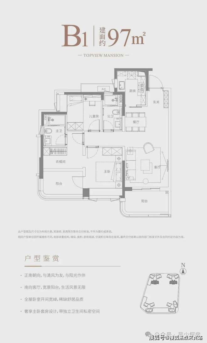 97㎡的3房2厅2卫,设计的竖厅格局,客厅3.5米开间,客餐厅一体化,三开间朝南,3个卧室分别是3.2米/3米/2.6米的宽度,U型厨房,得房率:76.55%(不含赠送),朝南向看花园。