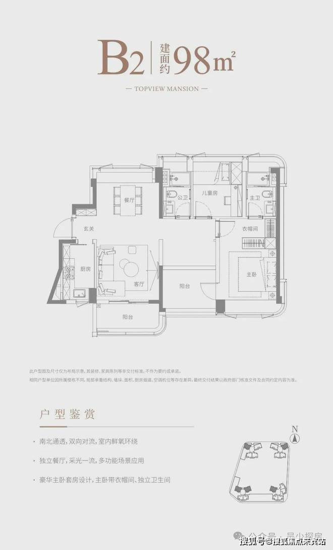 98㎡的3房2厅2卫,设计的横厅南北通透格局,进门入户玄关,客厅3.5米开间,四开间朝南,3个卧室分别是3.2米/3米/2.8米的宽度,L型厨房,得房率:75.91%(不含赠送),阳台主朝西南或东南向。
