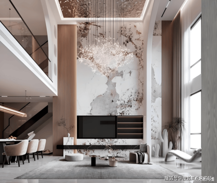 6米挑空客厅光柱如瀑,阳光穿透整面落地窗投射出光影长廊。打通二楼后变身270°环幕横厅,整面弧形玻璃幕墙框住城市天际线。晨光漫洒时如置身艺术馆,夜晚灯光亮起似银河倾泻,连家具摆放都成为空间美学的表达。