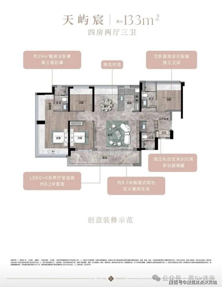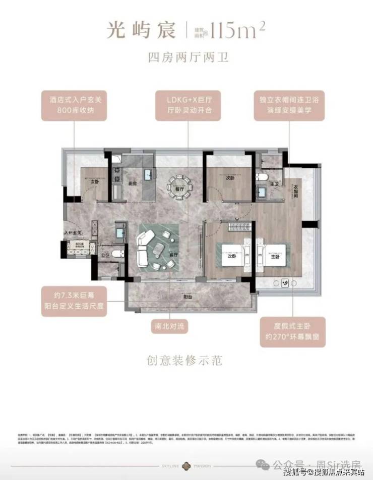 115㎡的4房2厅2卫,设计的是竖厅南北通透格局,进门入户玄关,客厅4.45米开间,餐客厅分离设计,客厅连接次卧出10.87m²的观景大阳台,L型中式+岛台灵动式厨房,公卫三段式干湿分离,得房率约78.27%(不含赠送),阳台主朝东南或西南向。靓点:南北对流+7.25米长超大观景南向阳台,超大主卧+270°无柱转角飘窗。