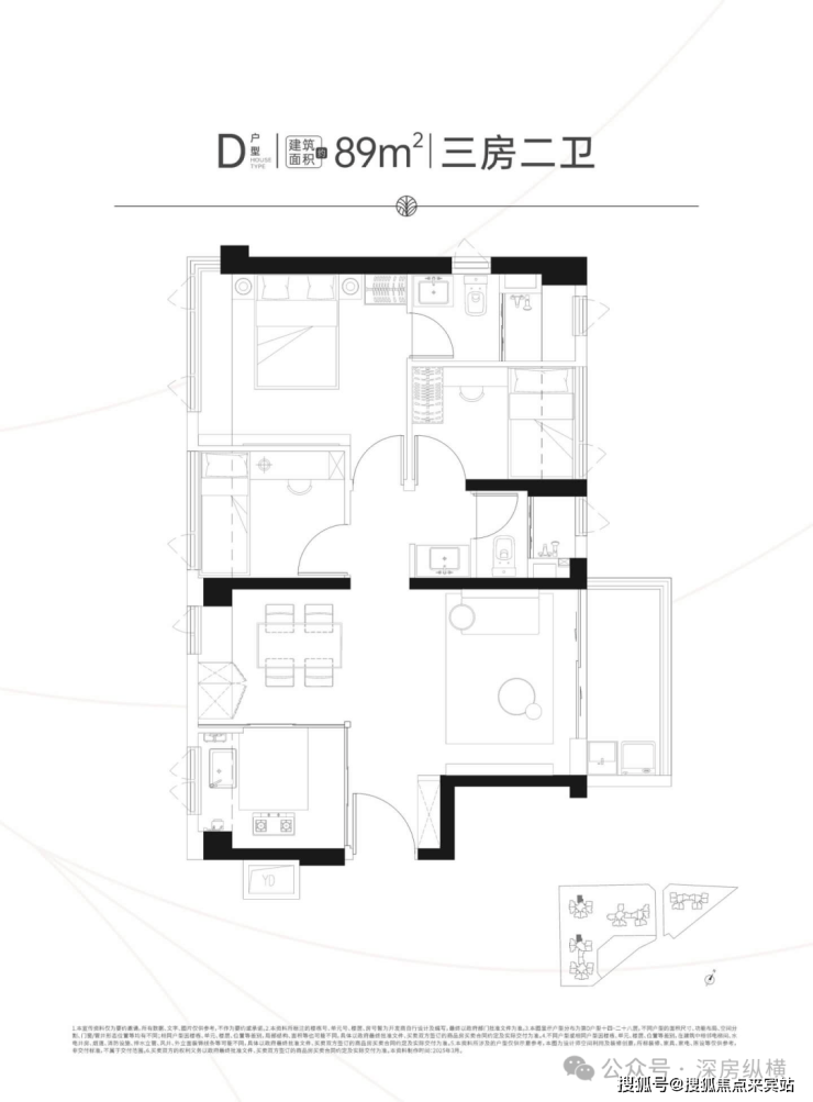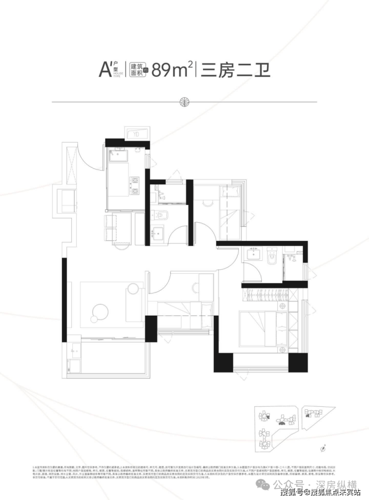 建面约89㎡舒适三房二卫,超宽阳台紧连客厅,全屋明亮通透,空间运用更自由。