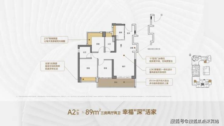 竖厅格局,客厅3.5米开间,LDKB一体化,S墙设计预留冰箱卡槽位,客厅连接次卧出5.9米长的大阳台,主卧双面飘窗,次卧270度转角飘窗,U型厨房,卫生间干湿分离,阳台有朝西向、东向、南向。
