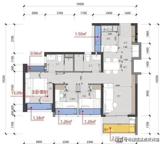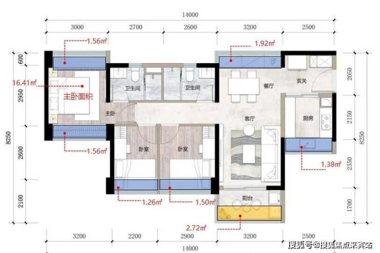 建面约88㎡户型,额外可使用面积合计约13.04㎡:飘窗部分额外可使用面积约10.32㎡,阳台部分额外可使用面积约2.72㎡