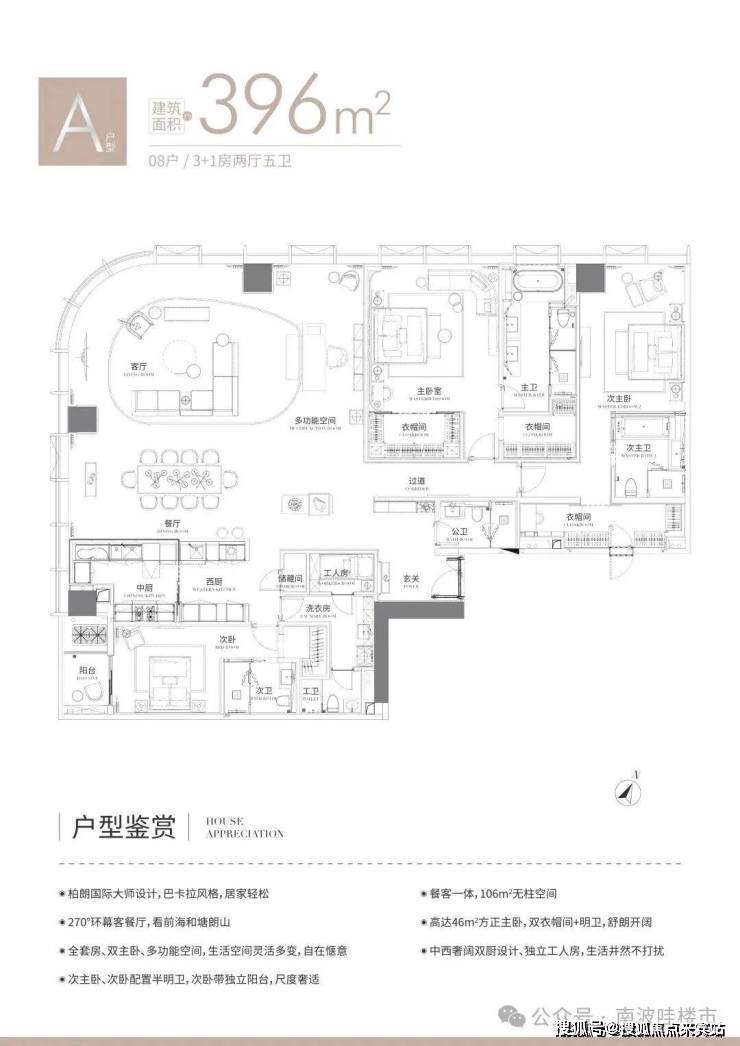 A户型:396㎡,3+1房2厅2厨5卫,西北向,全套房双主卧,次卧带阳台