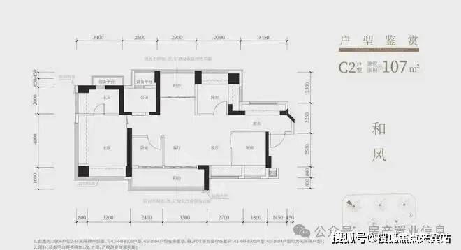 107㎡的4房2厅2卫,设计的是横厅南北通透格局,进门赠送约4㎡入户玄关,客餐厅5.9米开间,4个卧室分别做到了主卧17.9㎡/次卧9.48㎡/次卧8.47㎡/次卧6.06㎡(实测面积,去掉墙体),主卧+1个次卧270°飘窗,客厅连接次卧出5.7米长大阳台,U型厨房,得房率约102.5%(包含赠送),阳台主朝西南向。