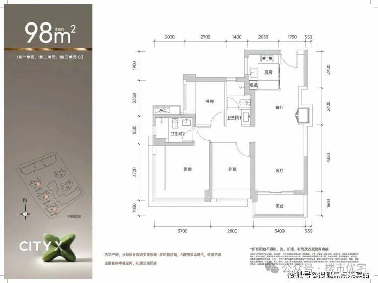建面约98㎡3房2卫,适合追求尺度的家庭。
