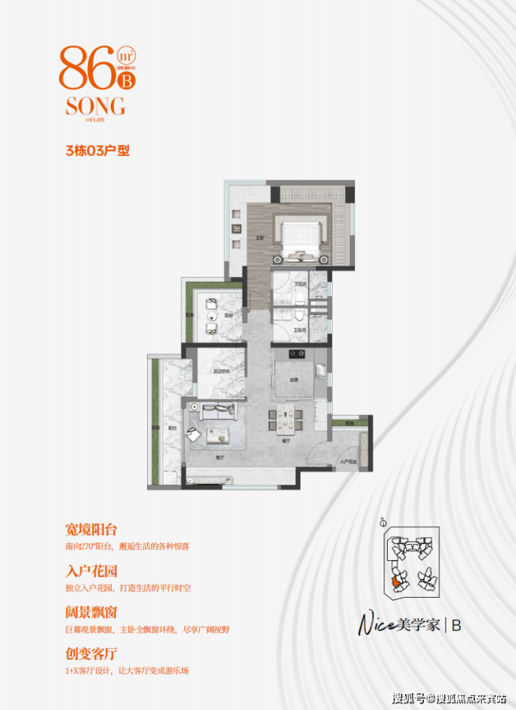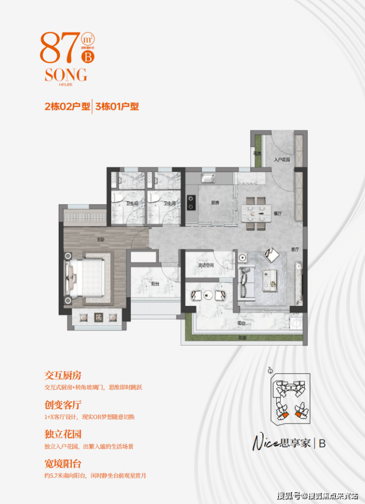 ▪南北对流 ,三开间朝南望中心花园,1+X客厅设计,客厅开间约3.8米