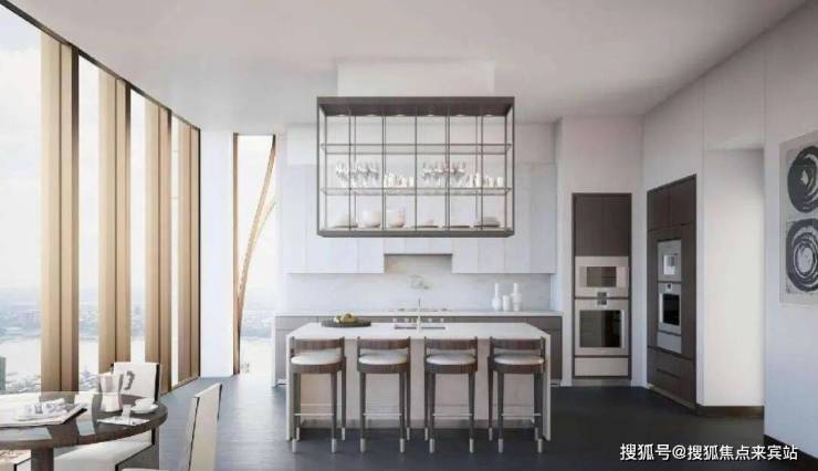 约70㎡客餐厅进深达13.4米,电视背景墙采用芬迪、范思哲等世界品牌石材,庄重典雅;U型厨房带专用空调,奢配开放式独立岛台。