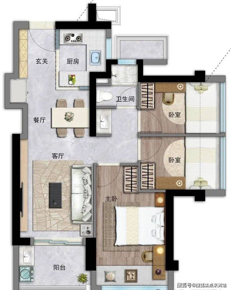 约76㎡3房2厅1卫:竖厅设计,进门入户玄关,S墙设计预留冰箱位,U型厨房,餐客厅一体连接阳台,卫生间三段式分离,阳台是朝东北、东南或西南向。