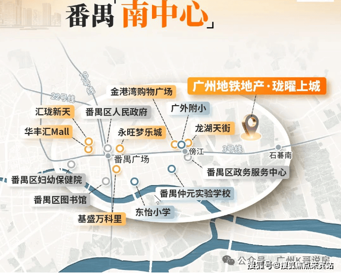 距项目2站的番禺广场,番禺区府所在地,集合番禺的行政、交通、教育、医疗、文化中心,是与北万博平齐的番禺南中心。
