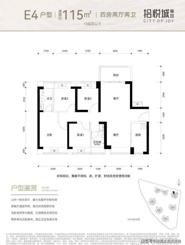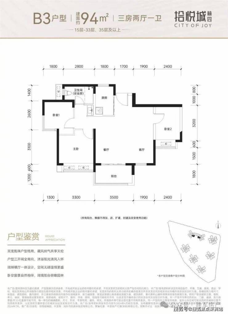 100平三房:设计的是竖厅格局,进门入户玄关,客厅3.4米开间,LDKB一体化设计,3个卧室分别做到了3米/2.9米/2.5米的宽度,U型厨房,公卫三段式分离,得房率:77.14%(不含赠送),阳台1.8米宽度,西南或东南朝向。
