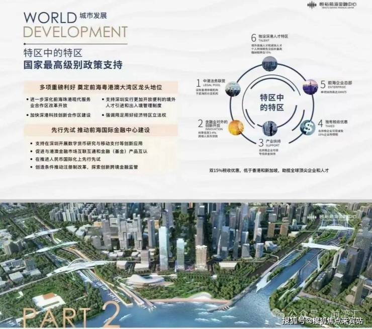 1.湾区核心 - 前海作为国家级战略的双重核心引擎,特区中的特区。享最高级别的政策支持,双15%税收优惠,助揽全球顶尖企业和人才,启幕世界级金融中心。