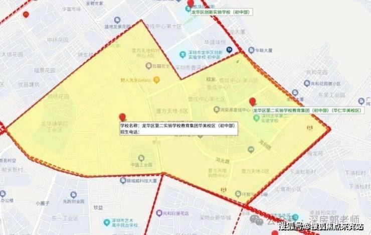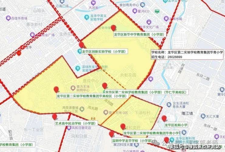 依据2024年龙华区教育局的学区划分方案,小学学区涵盖龙华第二实验学校华美校区、龙华区新华中学教育集团小学部;初中学区为龙华第二实验华美校区。