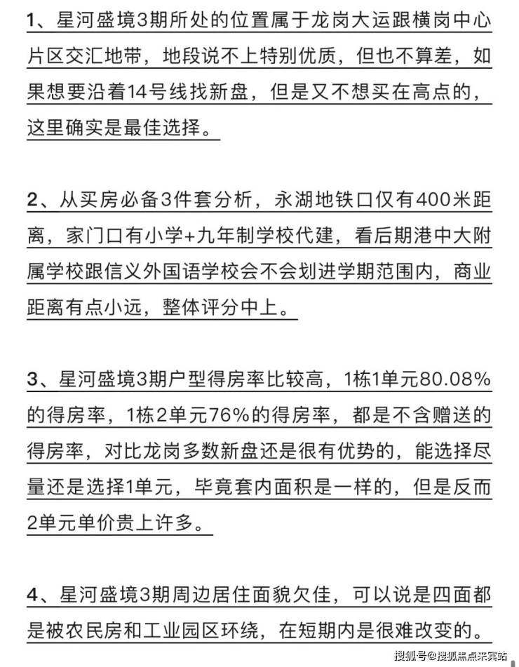 星河盛境3期,总占地面积约3.7万㎡,总建筑面积约26万㎡,分两个地块开发,总规划1466户。星河盛境3期于2023年11月30日取证入市,推出1栋1单元,总层高33层,2梯6户,1栋2单元,总层高49层,3梯6户,共467套房源。有83-87平3房2厅2卫,94-96平3房2厅2卫,106-113平4房2厅2卫。总价折后290万,单价3.3万,带精装修交付,合同26年2-3月份交付,工程进度快可以在25年底之前交付。