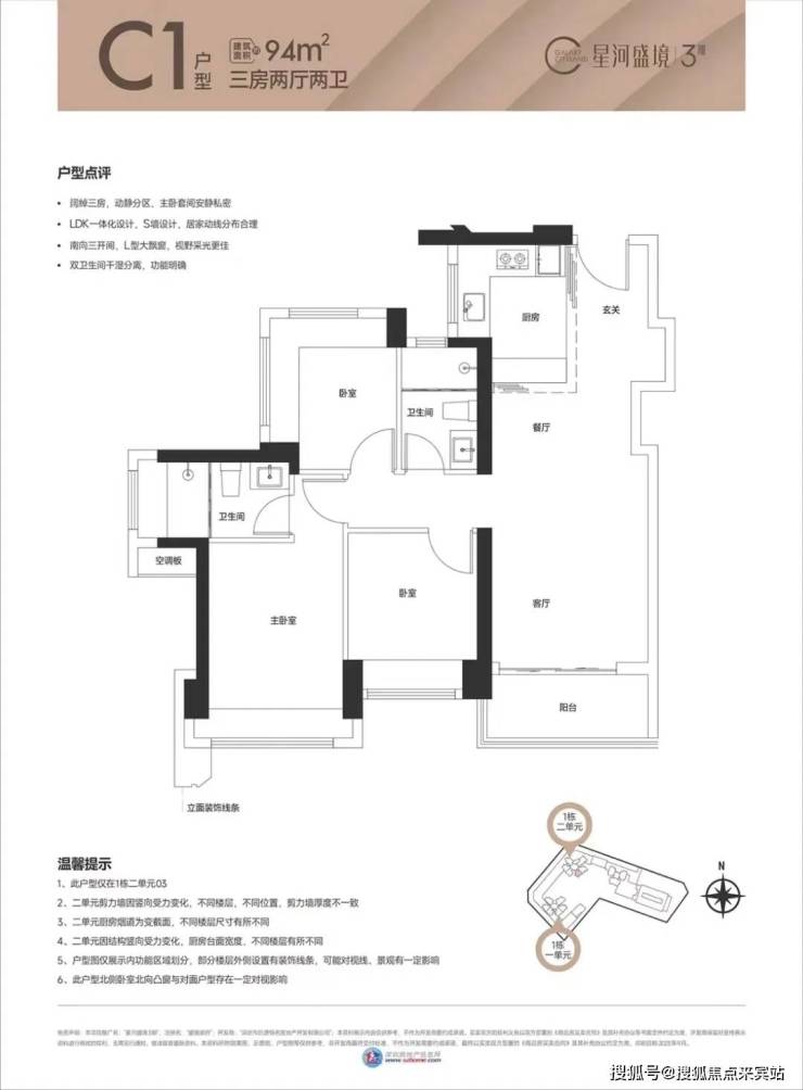 94-96㎡的3房2厅2卫(1栋2单元03/04户型),设计的是经典竖厅格局,创新LDK一体化餐客厅,S墙设计预留冰箱位,三开间朝南,次卧270度环幕设计,U型厨房,卫生间干湿分离,得房率76%(不含赠送),全部东南朝向。