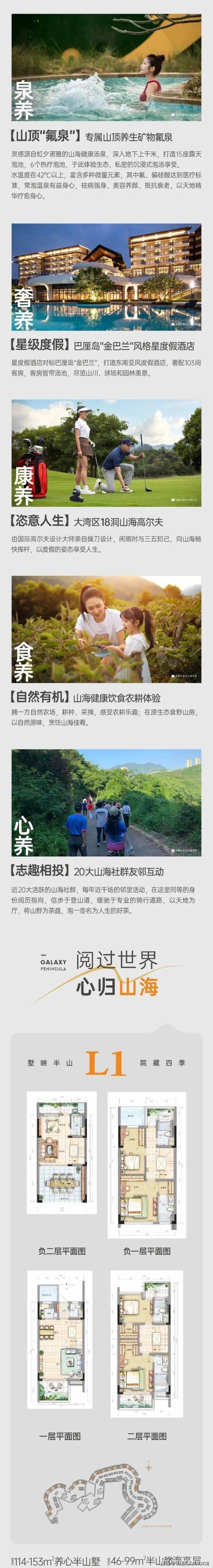 在项目的开发上,更是不遗余力的打造有:“十佳非凡高尔夫球场”的星河山海半岛高尔夫;对标巴厘岛“金巴兰”东南亚风格的高端星度假酒店;专门为业主打造的18万m²的中央公园;以及满足生活的山海特色商业街等。