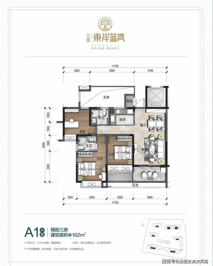 板式结构,南北通透,通风采光极佳▼A1户型: 102㎡ 精致三房