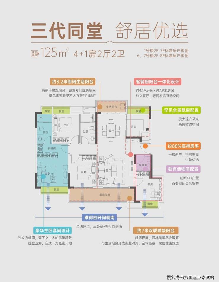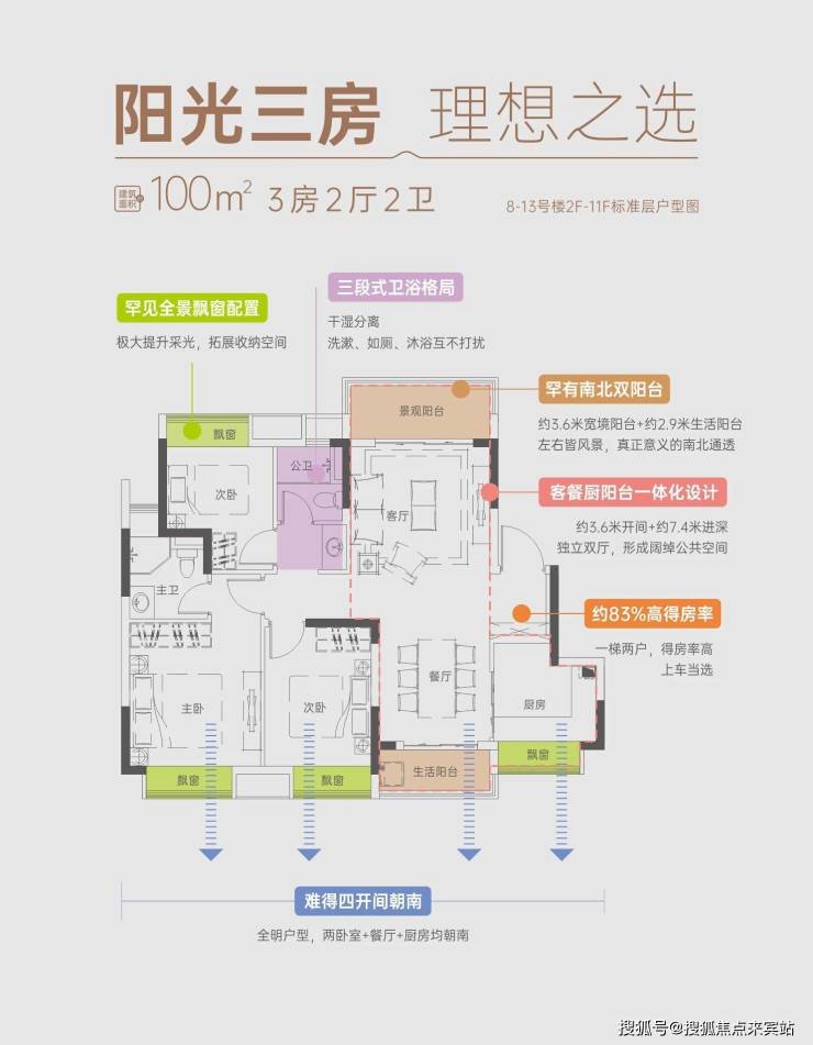 二期高层洋房:96-120㎡的 3-4 房,三面都朝南,还有 6.6 米宽的大阳台,全屋飘窗都是送的。