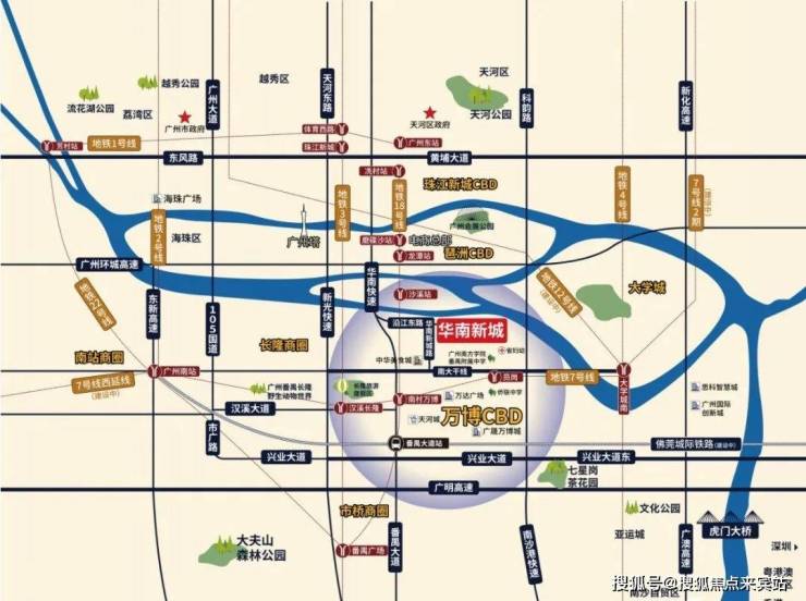 华南新城位于番禺区北部,临江靠山,西临华南快线,东与大学城隔江相望,北临珠江,南面是兴南大道和万博CBD。同时合生系在周边仍有大量建设用地,正在分批开发,致力以华南新城为核心,打造华南板块城市居住群。