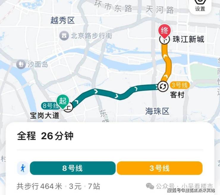 地铁去往珠江新城:乘坐8号线5个站到客村换乘3号线,再到珠城,全程7个站,耗时26分钟左右。