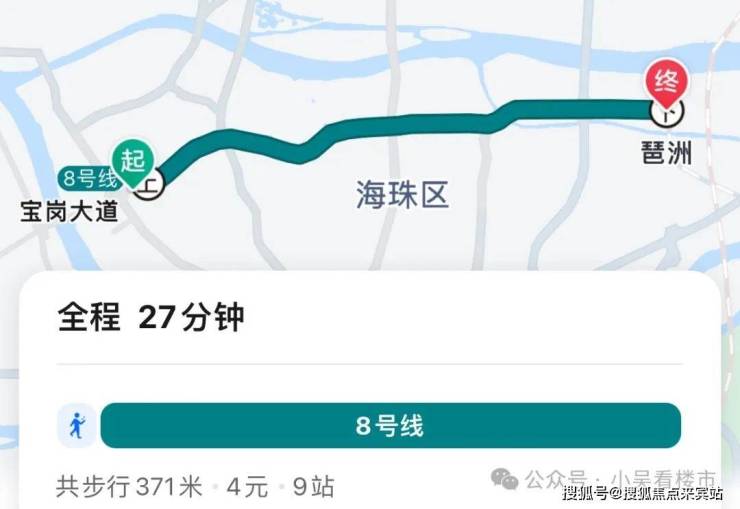 地铁去往琶洲:步行至地铁站,乘坐8号线直达琶洲,全程9个站,耗时27分钟左右。