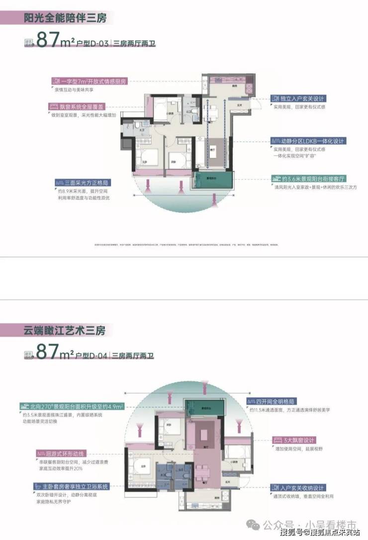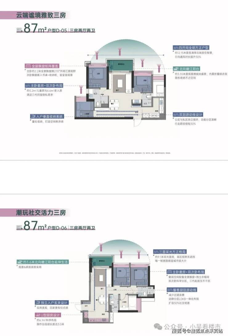 中旅天宸府占地约1.4万㎡,体量不大,共规划有4栋44-46层的超高层住宅,目前主要在售新加推的D栋,也是小区最后一栋,总层高44层,3梯6户,有4户87,1户90平,1户107平,其中北向87平总价39X万起,南向87平总价415万起,户型图如下: