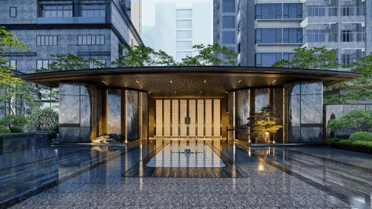 社区大门约18米宽5米高,采用了大量的金属和天然石材元素,视觉体验直追豪宅享受,对称式迎宾水景,叠加特色景石,把气场直接打开。