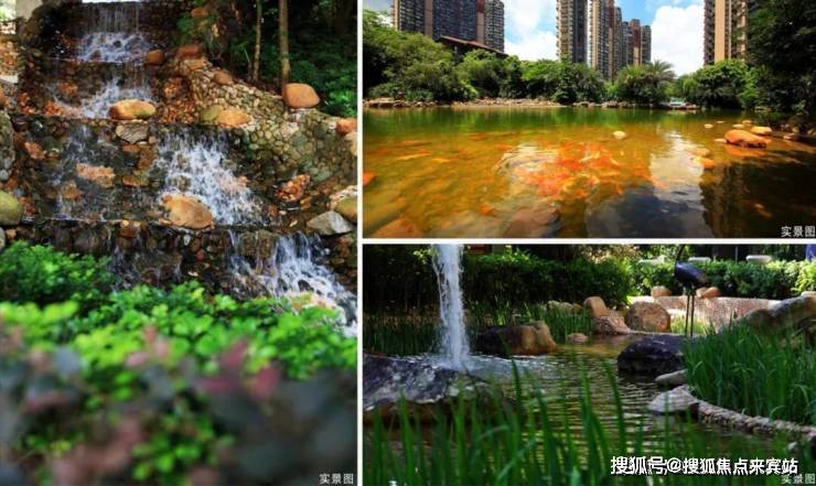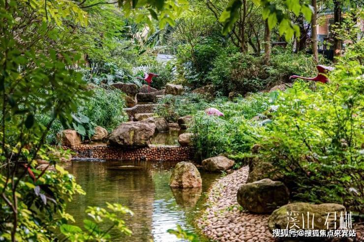 项目内部打造了一条沿着台地蜿蜒的溪流,该水系为市面罕见的活水溪流,贯穿整个社区园林,依据溪岸的曲直不同和地形变化,打造叠水、溪流、瀑布、水潭等多样特色水景,溪岸植物种类繁多,与水流互为风景,沿岸专门设置不同的亲水平台,营造自然灵动的栖心之境。