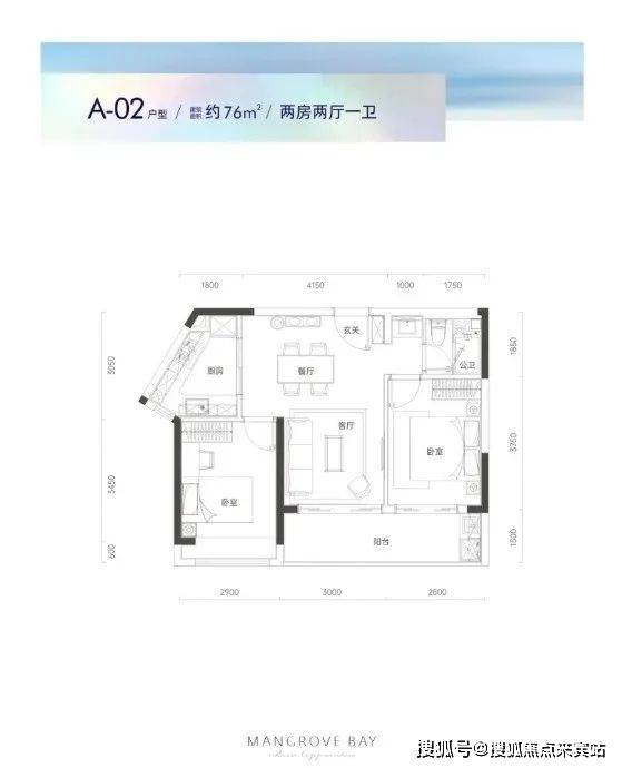 A02户型76平2房2厅1卫:房间和客厅朝南向,采光充足;约5.8米开阔观景阳台,俯瞰红树林自然生态;动静干湿自然分离,生活有序互不干扰。