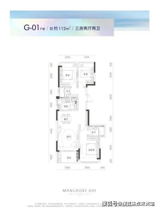 G01户型112平3房2厅2卫:同样拥有客厅、餐厅连通阳台的设计,自然采光充足;全屋飘窗,尽享超大采光面;主卧独立卫生间;动静干湿分离。
