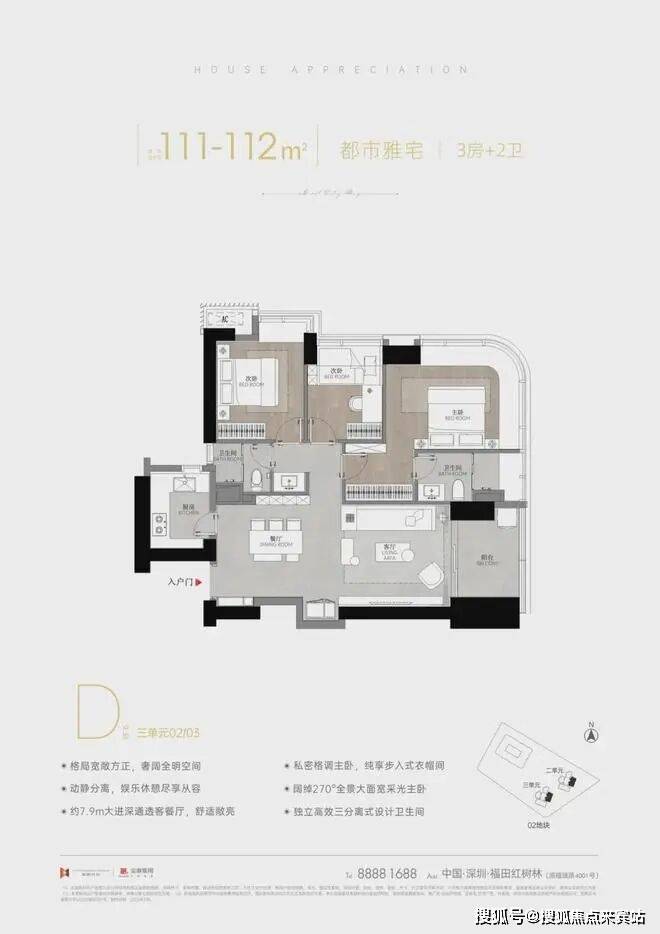 建面约111-112㎡纯正3房2卫:项目首次推出产品!东南朝向看城市景观,主卧带衣帽间+三分离卫浴,动静分区,总价直接砍到1023万起。