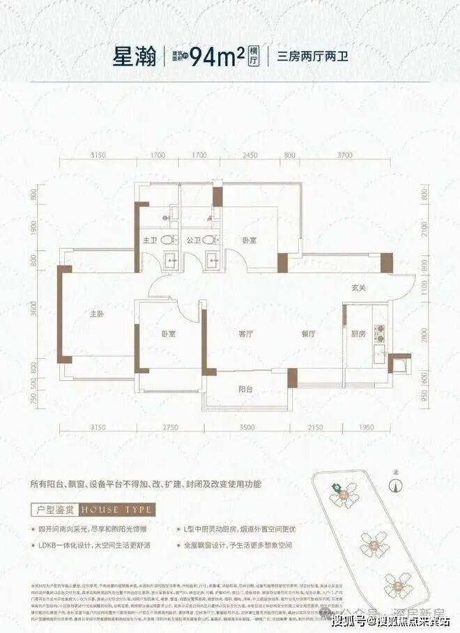 94㎡的3房2厅2卫(竖厅),设计的是经典竖厅格局,进门入户玄关,客厅3.5米开间,LDKB一体化,S墙设计预留冰箱卡槽位,动静分区,三开间朝南,分别做到了主卧17.35㎡/次卧10.5㎡/次卧9.45㎡(包含墙体飘窗),U型厨房烟道外置,公卫三段式分离,还带1个设备平台,得房率约100%(包含赠送),阳台约5.42㎡东南朝向。