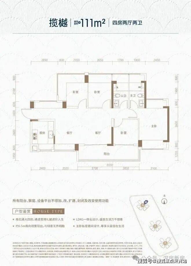 111㎡的4房2厅2卫,设计的是横厅南北通透格局,独门独户,进门入户玄关,客餐厅6.25米开间,LDKB一体化,全屋10面飘窗,主卧南北通,分别做到了主卧16.6㎡/次卧10.54㎡/次卧9.27㎡/次卧7.41㎡(包含墙体飘窗),U型厨房,卫生间干湿分离,得房率约102%(包含赠送),客厅连接次卧出6.55米长的大阳台,约10.8㎡主朝东南向。