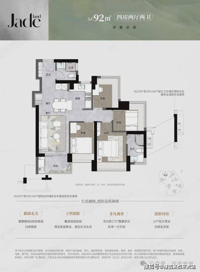 92㎡的4房2厅2卫,设计的是经典竖厅格局,进门入户玄关,LDKB一体化,S墙设计预留冰箱卡槽位,四开间朝南,21个次卧270度飘窗,L型灵动式厨房,卫生间干湿分离,得房率约91.5%(包含赠送),东南朝向。