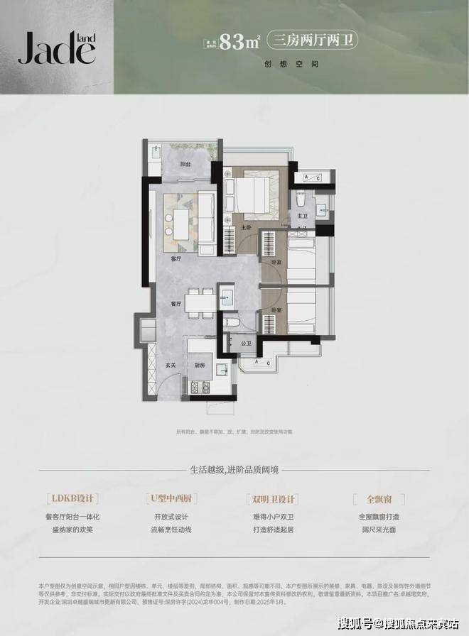 83㎡的3房2厅2卫,设计的是竖厅格局,进门入户玄关,LDKB一体化,S墙设计预留冰箱卡槽位,U型厨房,主卫少了淋浴,公卫三段式分离,得房率约90.33%(包含赠送),阳台西北朝向。