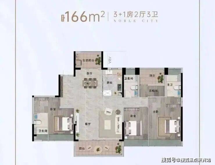 户型图鉴赏:在售翰府楼栋为点状式分布,近乎全南向布局,户型丰富,涵盖 85㎡小三房到 166㎡阔绰四房。