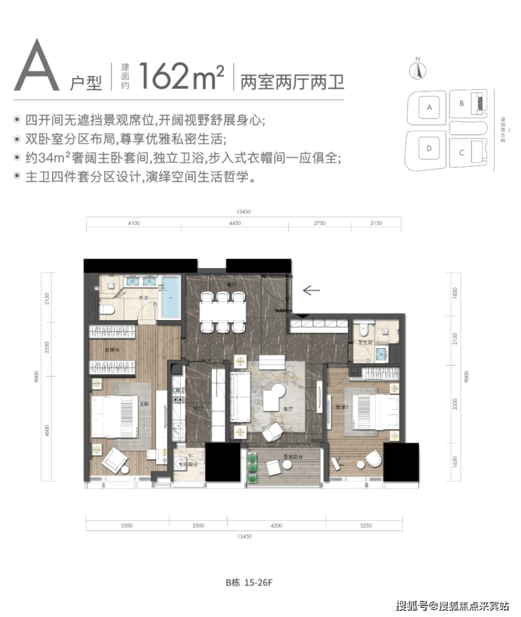 如:最低门槛户型1房为62-72平,2房户型为162/164平;