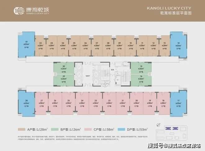 ① 首发乾寓户型: 北侧28、53㎡;南侧38、53㎡;东、西两侧26㎡,5梯30户。项目将于9月开盘;2026年精装交楼。