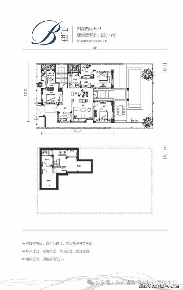 B户型:四室两厅五卫/建面约195 ㎡