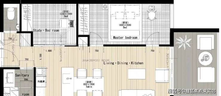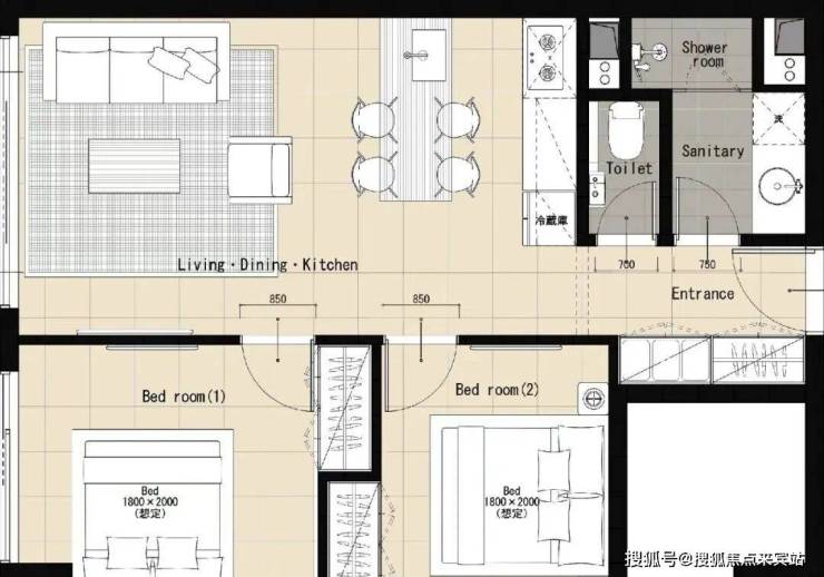 B户型 建筑面积70-75㎡ 2房2厅1厨1卫