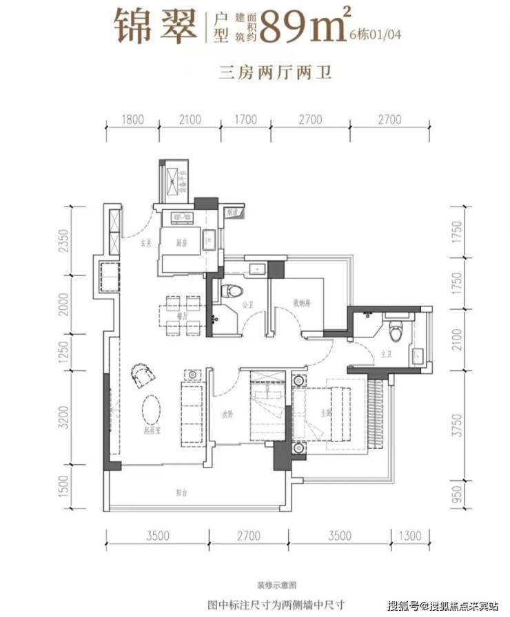 89㎡的3房2厅2卫,6栋01/04户型,经典竖厅,客厅3.5米宽,LDKB一体,S墙预留冰箱位。三开间南向,动静分区。主卧15.25㎡、次卧7.56㎡、次卧6.48㎡(含墙体飘窗),270°转角飘窗。U型厨房外置烟道,卫生间干湿分离。得房率97.47%(含赠送)。客厅连次卧大阳台11.46平,西南/东南朝向。✅绿城锦和玉鸣售楼处电话:400-865-1207✅︎✅︎✅