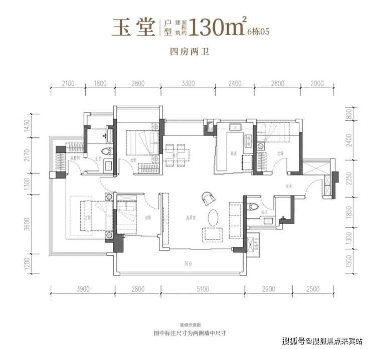 130㎡的4房2厅2卫,设计:南北通透,独立玄关,客厅5.1米宽。客餐厅分离,主卧270°飘窗+衣帽间,面积分别为23.66㎡、11.2㎡、8.96㎡、7.84㎡(含墙体飘窗)。U型厨房外置烟道,卫生间干湿分区,得房率101.95%(含赠送)。客厅连次卧大阳台14.09平,东北向。