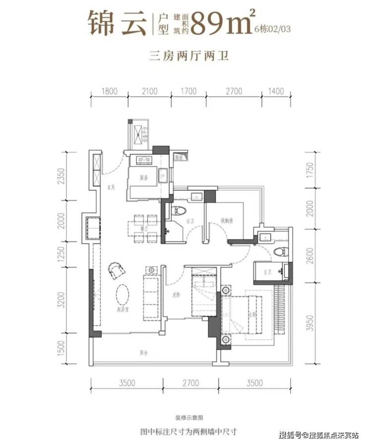 89㎡的3房2厅2卫,6栋02/03户型,经典竖厅,客厅3.5米宽,LDKB一体。S墙预留冰箱位,三室朝南,动静分区。主卧15.25㎡、次卧7.56㎡、次卧6.48㎡(含飘窗)。U型厨房外置烟道,卫生间干湿分离,得房率97.47%(含赠送)。客厅连次卧大阳台11.46平,西南/东南朝向。区别在次卧与主卫空间。