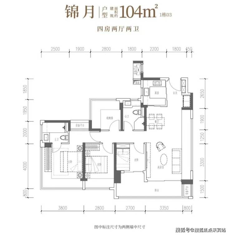 106㎡的4房2厅2卫,竖厅设计,客厅3.7米宽,LDKB一体,南向四开间,动静分区。主卧270°飘窗带1.52㎡平台,面积分别为20.34㎡、11.2㎡、7.7㎡和6.75㎡(含墙体飘窗)。U型厨房外置烟道,卫生间干湿分离,得房率101.16%(含赠送)。客厅连次卧大阳台11.76㎡,东南向。
